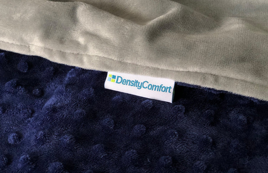 Our calming weighted blanket is made with 100% cotton. It is designed with several compartments that are filled with glass beads. Density Comfort Calming Weighted Blankets come filled with non-toxic, hypo-allergenic, and odorless glass beads to provide evenly distributed weight. They are made with 6 loops to hold the blanket more securely in place when covered with our super soft Minky weighted blanket cover. Fewer loops cause blankets to slide inconveniently and shift the internal covers.